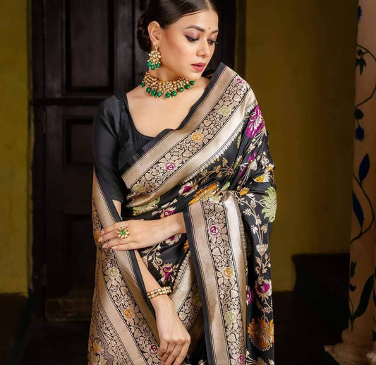Black Handwoven Pure Katan Multi Meenakari Banarasi Saree