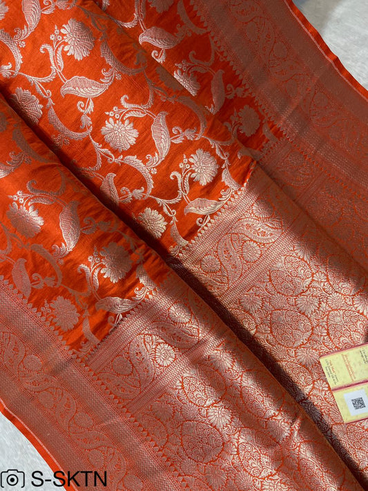 Pure Handloom Katan Cutwork Orange Banarasi Saree