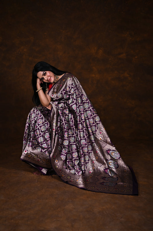 Purple Handwoven Pure Katan Meenakari Banarasi Saree
