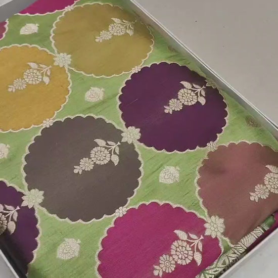 Showcasing A Rangkat saree,this is a traditional Indian saree characterized by its vibrant, multi-colored patterns and intricate designs. Originating from regions with rich weaving traditions, these sarees often showcase a beautiful interplay of colors created through the tie-dye technique, combined with zari work or motifs. The fabric is usually lightweight, such as silk or cotton, making it suitable for festive occasions and formal events. The unique gradient or striped effect of colors gives the saree its distinctive appeal, exuding elegance and cultural charm. Perfect for weddings, celebrations, or cultural gatherings, the Rangkat saree is a testament to India's rich textile heritage.đź’š