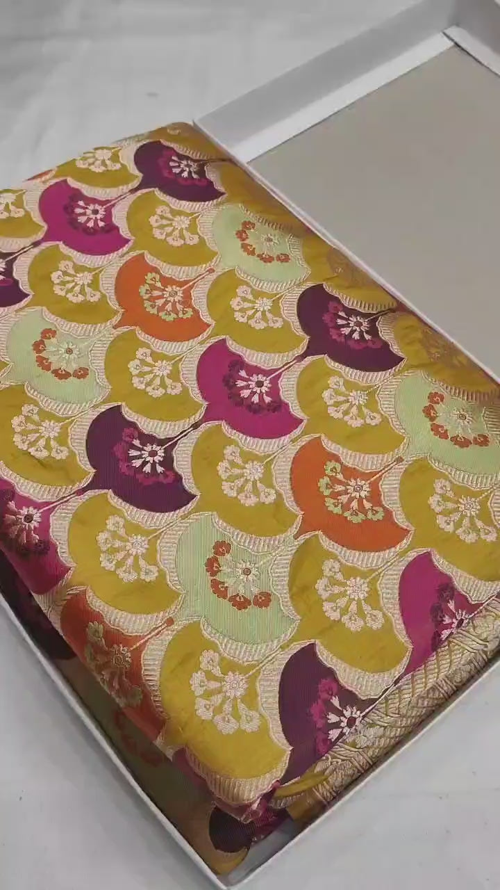 Showcasing A Rangkat saree,this is a traditional Indian saree characterized by its vibrant, multi-colored patterns and intricate designs. Originating from regions with rich weaving traditions, these sarees often showcase a beautiful interplay of colors created through the tie-dye technique, combined with zari work or motifs. The fabric is usually lightweight, such as silk or cotton, making it suitable for festive occasions and formal events. The unique gradient or striped effect of colors gives the saree its distinctive appeal, exuding elegance and cultural charm. Perfect for weddings, celebrations, or cultural gatherings, the Rangkat saree is a testament to India's rich textile heritage.đź’›