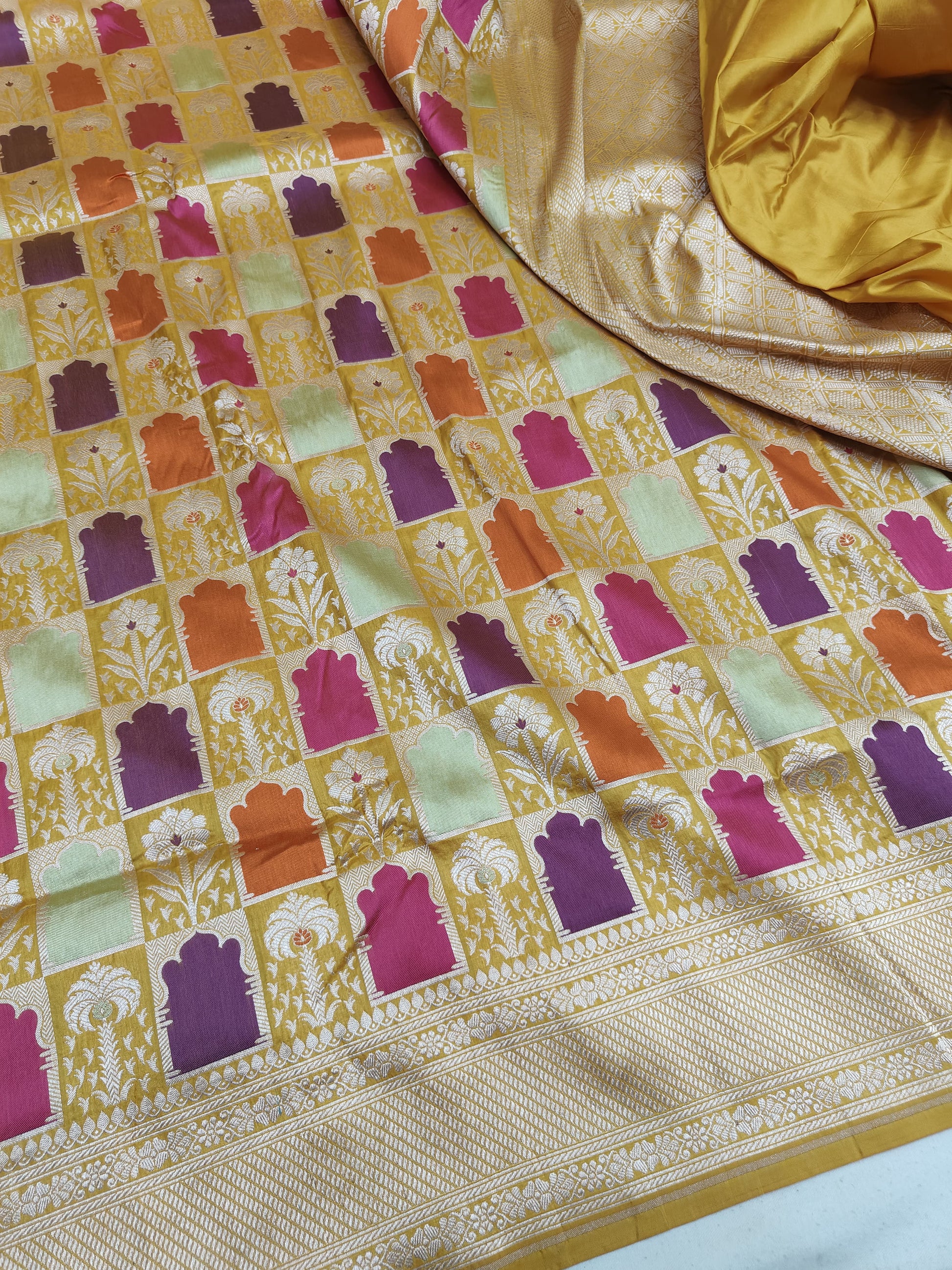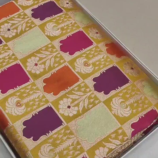 Showcasing A Rangkat saree,this is a traditional Indian saree characterized by its vibrant, multi-colored patterns and intricate designs. Originating from regions with rich weaving traditions, these sarees often showcase a beautiful interplay of colors created through the tie-dye technique, combined with zari work or motifs. The fabric is usually lightweight, such as silk or cotton, making it suitable for festive occasions and formal events. The unique gradient or striped effect of colors gives the saree its distinctive appeal, exuding elegance and cultural charm. Perfect for weddings, celebrations, or cultural gatherings, the Rangkat saree is a testament to India's rich textile heritage.đź’›